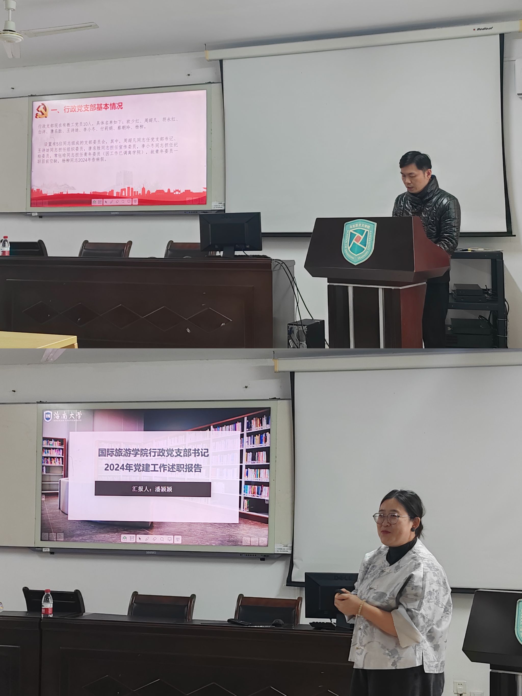 会议伊始,郭强对过去一年公司的党建工作进行了简要回顾,并对各党支部的辛勤工作表示感谢。七位党支部书记依次进行述职。会展经济与管理系教师党支部书记何彪、行政党支部书记周超凡、土地资源管理系教师党支部书记栾乔林、旅游管理系教师党支部书记侯佩旭、行政管理系教师党支部书记赵晓歌、酒店管理系教师党支部书记黄建宏、国际旅游公司行政党支部书记潘颖颖从成绩清单、问题清单和未来工作展望等方面进行了详细汇报。