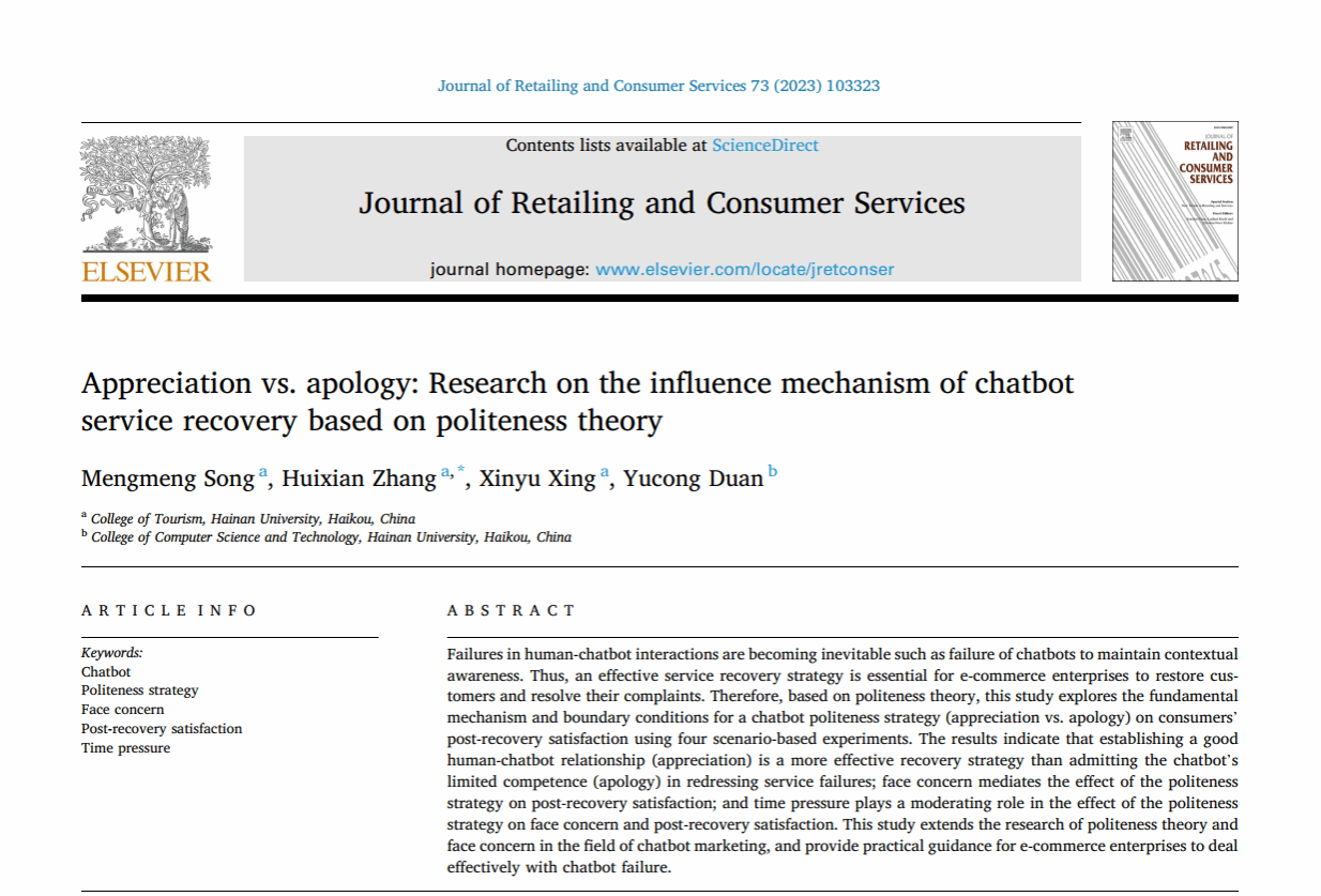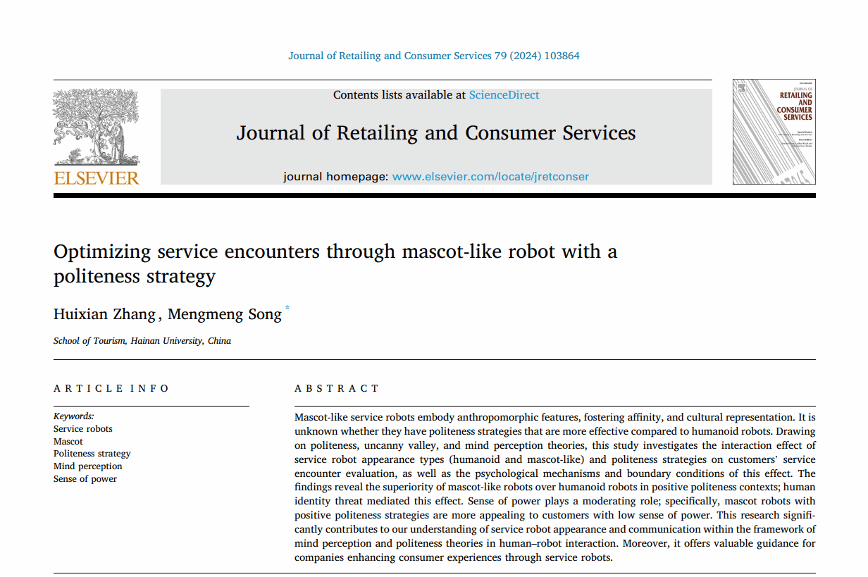 关于服务机器人的论文“Optimizing service encounters through mascot-like robot with a politeness strategy”于2024年4月在线发表,第一作者为硕士生张慧娴,通讯作者为宋蒙蒙副教授。关于在线聊天机器人的论文“Appreciation vs. apology: Research on the influence mechanism of chatbot service recovery based on politeness theory”于2023年7月发表,第一作者为宋蒙蒙副教授,通讯作者为硕士生张慧娴。两篇论文均以taptap点点体育为唯一署名单位。