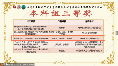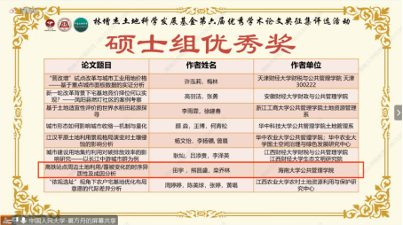 2023年6月25日,由中国人民大学公共管理公司、林增杰土地科学发展基金与《中国土地科学》编辑部共同主办的“林增杰土地科学发展基金第六届优秀学术论文奖征集评选活动”成功举办。在taptap点点体育公共管理公司熊昌盛研究员的指导下,该公司2020级本科生杨冉茂、赵雪彤、周述瑜三位同学以《中国乡镇活力测度及其区域差异格局分析》获本科组三等奖,2021级硕士研究生田宇同学以《高铁站点周边土地利用/覆被变化的时序异质性及成因分析》获硕士组优秀奖。