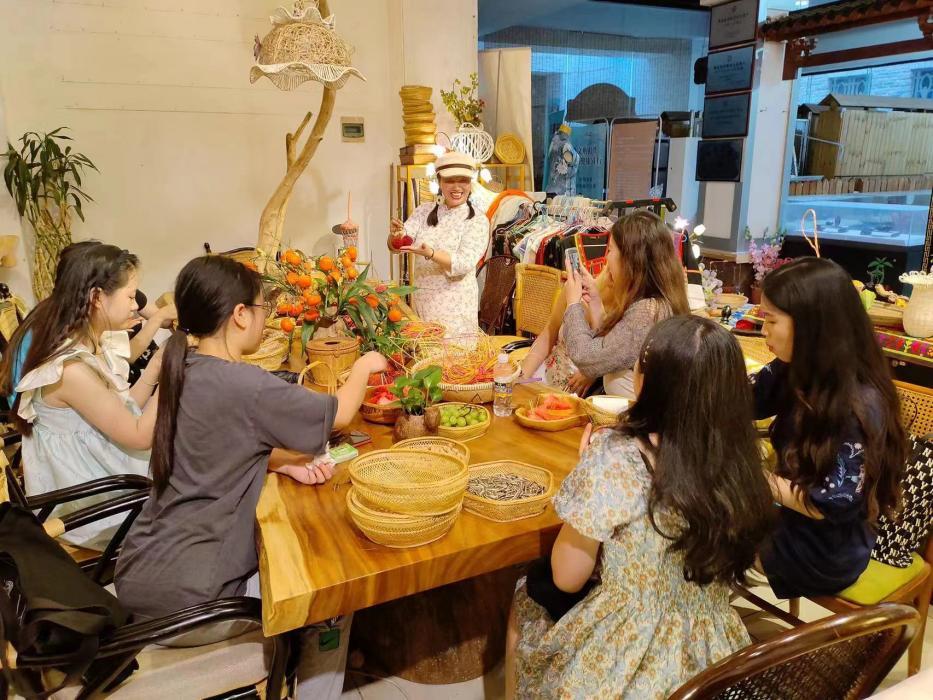 在海口骑楼老街,同学们分为两个小组进行海口文化旅游体验。一个小组由原骑楼总公司董事长赵爱华女士接待,为同学们详细介绍了骑楼老街建筑的传承与特色、阐释了骑楼业态的布局与变迁的影响因素,并在寰海阁博物馆酒店内与师生一行进行了交流,期间谈到澳门老街的建筑与文化等,让大家对骑楼建筑文化及商业业态有了更加深刻的认识。另一个小组由藤后实业公司的总经理杨育萍女士接待,为同学们讲解了藤后品牌的特色、介绍了民族与地方品牌的竞争力与发展空间、说明了品牌在以竹带塑领域的专利、产品及市场业绩。活动最后,两个小组均在藤后实业公司的工作室体验了藤编技艺,同学们很快学会了简易藤编,对于自己的作品甚是喜爱,在参与体验中恋恋不舍地结束了考察交流行程。