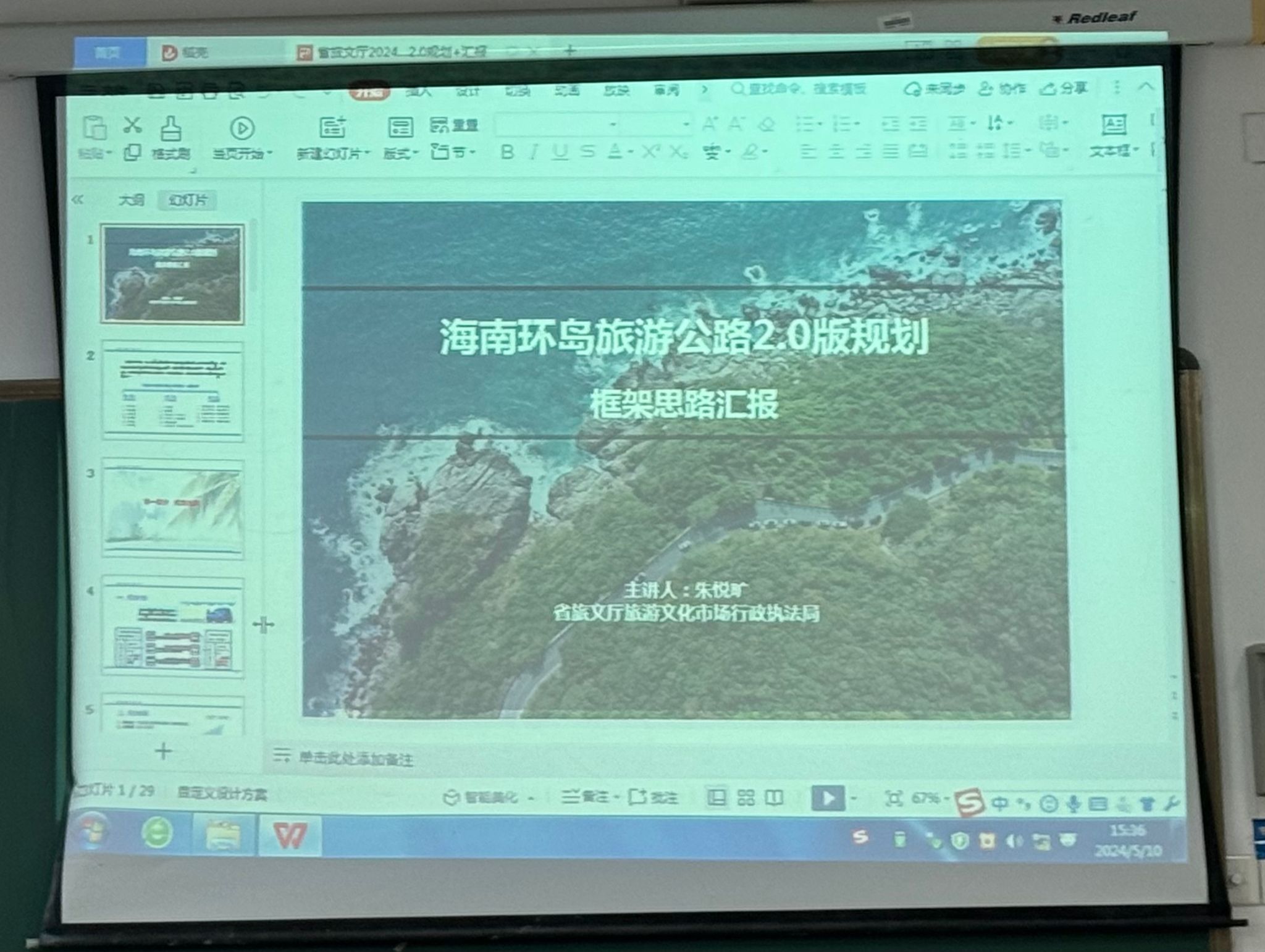 朱悦旷处长首先为我们介绍了旅游环岛公路的概念及其地理位置:全长988公里,途经12个市县,22个海角,包含了1200个滨海村庄。接着,朱处长又从建设旅游环岛公路初心的角度出发,阐述了建设旅游环岛公路是打造海南旅游的标志性项目,也是建设国际旅游消费中心的标志项目。随后,提出了建设环岛旅游公路的原因是将客流量均匀地带到海南全岛,还为大家介绍了海南旅游东热西冷、南重北轻的发展现状。紧接着,朱处长详细阐述了环岛旅游公路的战略意义,指出尽管目前还存在基础设施不完善等问题,但发展潜力巨大。最后,朱处长着重指出,海南旅游环岛公路的建设承载着省政府乃至中央政府的深切期望,我们必须全力以赴,将其精心打造成独一无二的道路型旅游产品。