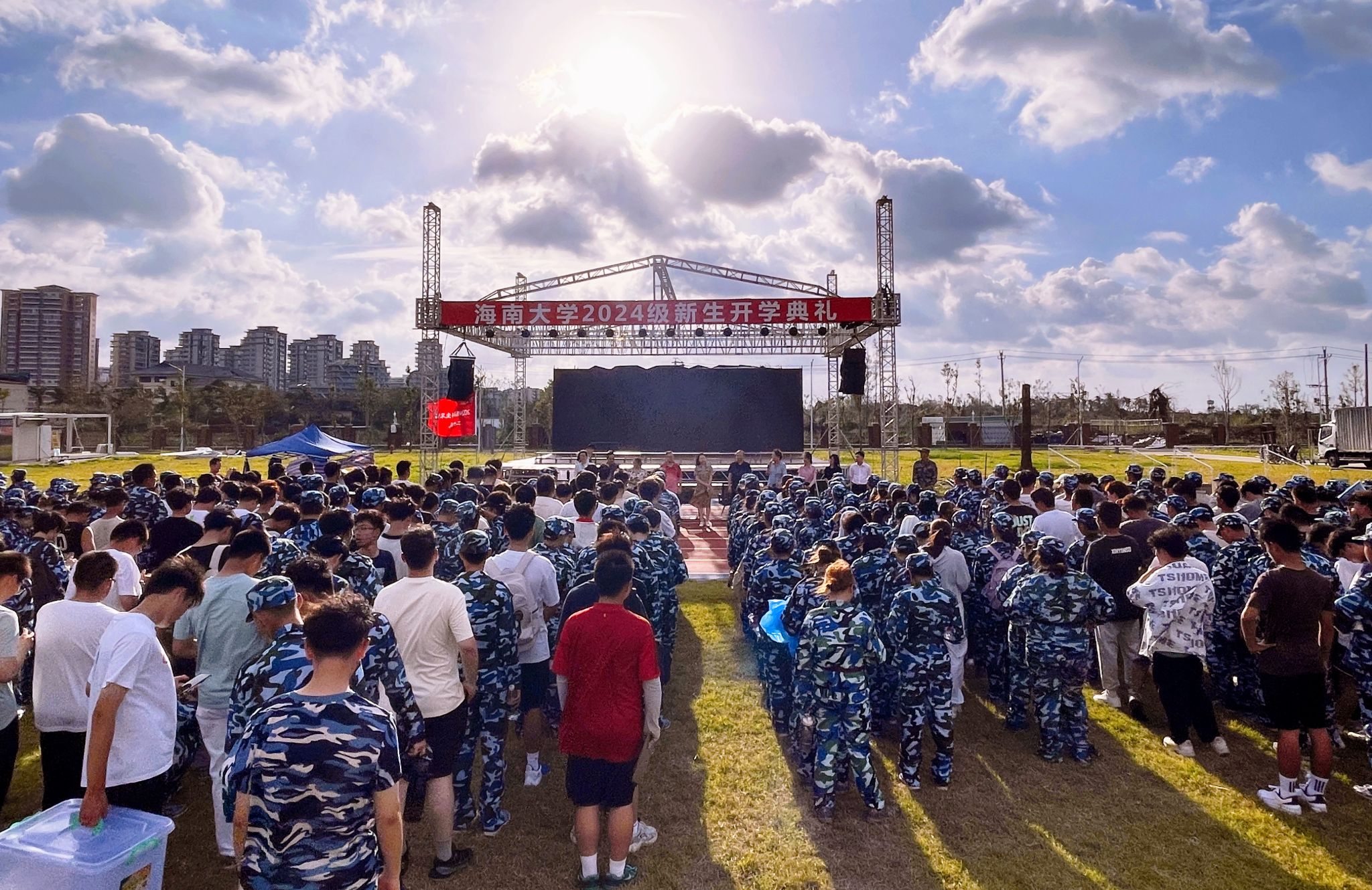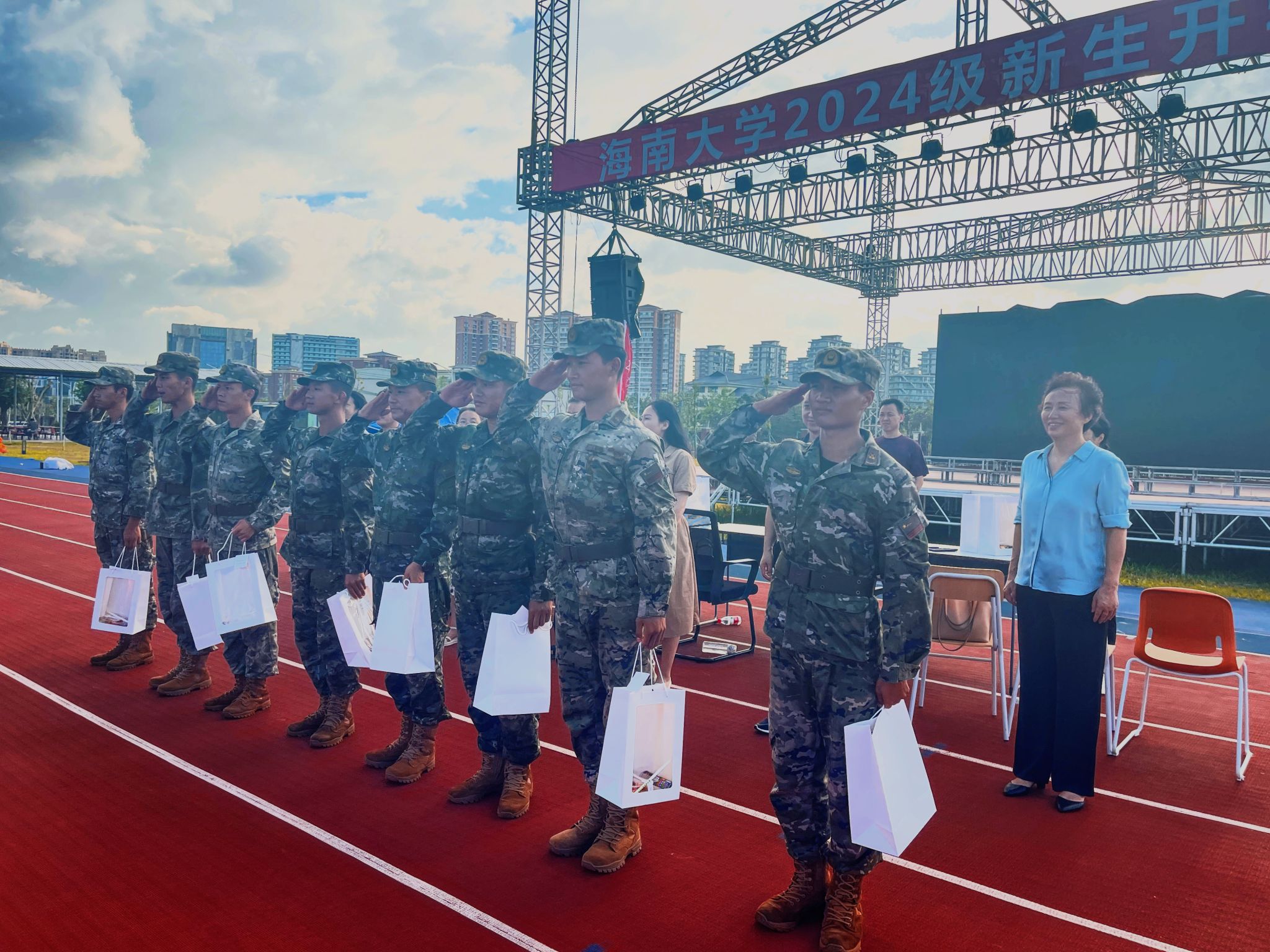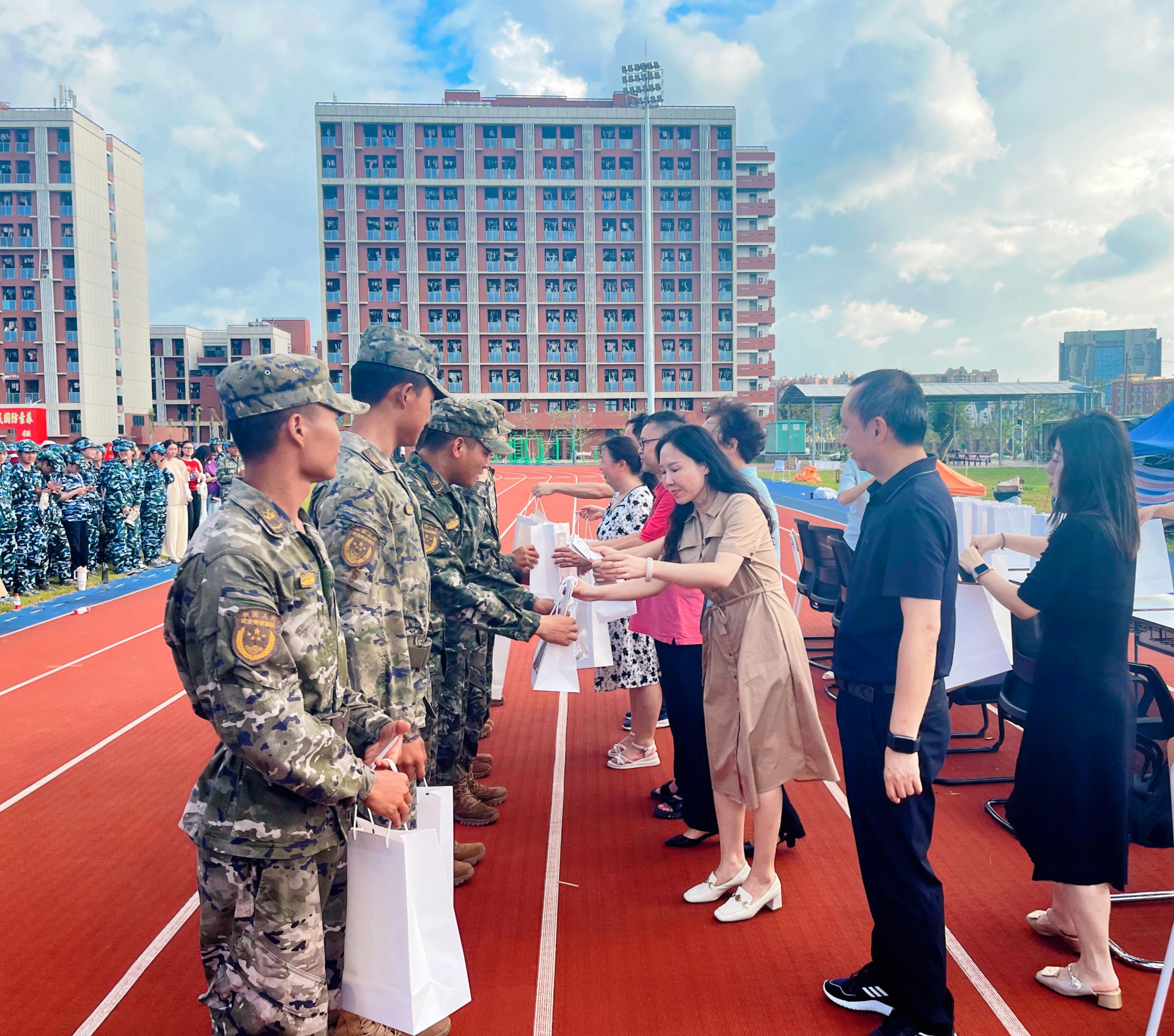 随后,公司领导班子向教官与新生发放了军训慰问品,传达了公司的温暖与关怀,员工们对领导们的到来感到非常惊喜和感动,他们纷纷表达了对公司的感激之情。现场洋溢着温馨和谐的氛围。