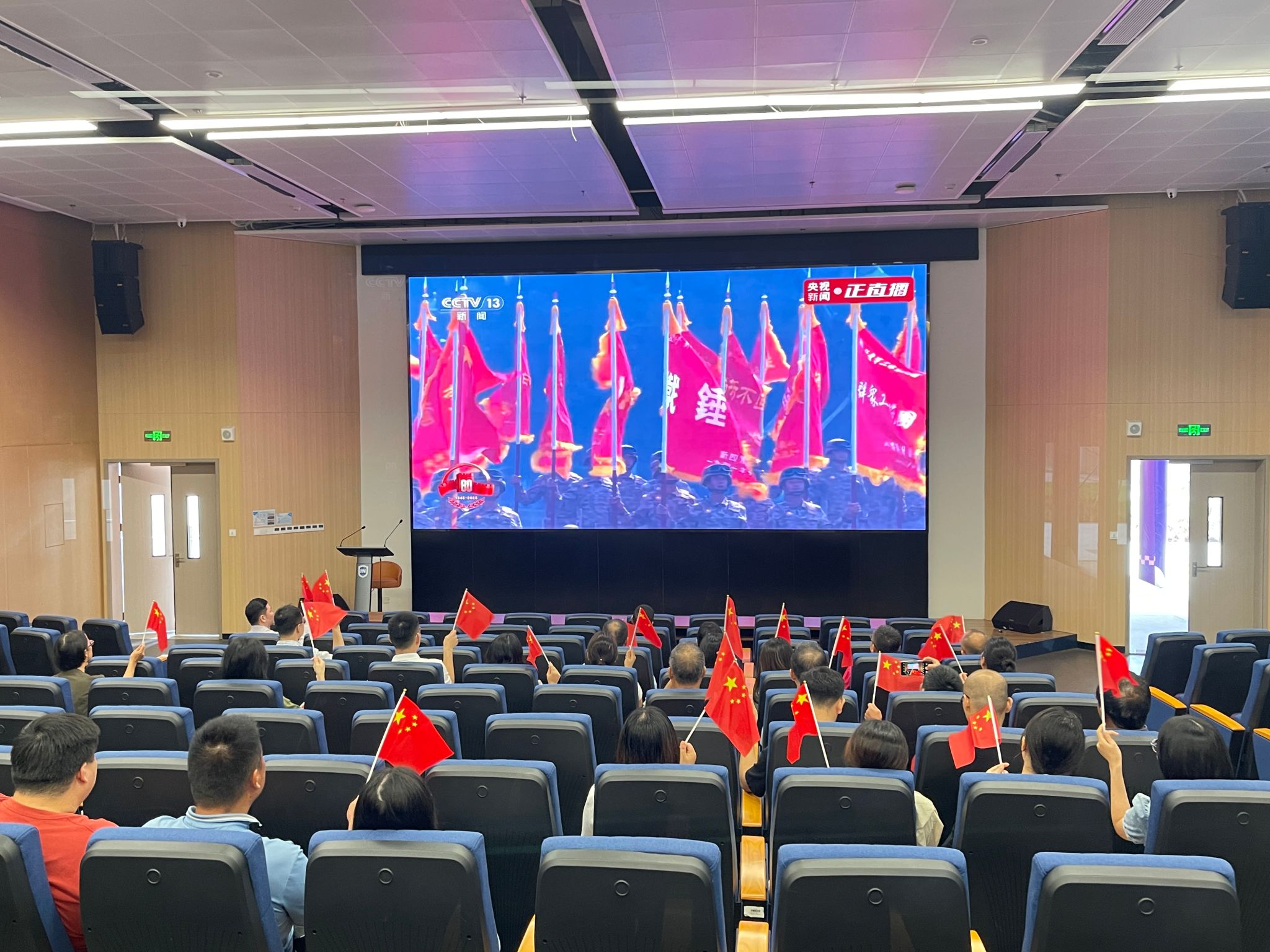 公司党委常委、副董事长岳文与公司班子成员、各支部党员、教师以及2025级新生在观澜湖校区一起收看直播盛况,同上一堂鲜活生动的爱国主义教育“开学第一课”。人民子弟兵庄严肃穆的军容、铿锵有力的步伐、英武雄壮的气势、精良的各式装备让师生们心潮澎湃、震撼不已,进一步激发了大家的爱国热情与民族自豪感。现场不时响起阵阵掌声。