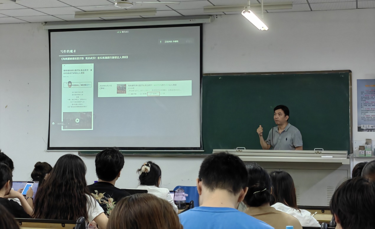 202211171920,海甸校区5-102教室,公共关系学专业2020级全体员工通过腾讯会议线上线下同步聆听了一场以“如何把主旋律新闻题材做成爆款”为主线的《新媒体的魔术》专题讲座。高级记者,现任海南日报社编委、法制时报社社长陈成智先生作为主讲人,用自己的轻松幽默与敬业激情给同学们上了一堂“新闻+创意=爆款”的新闻采访实务课。