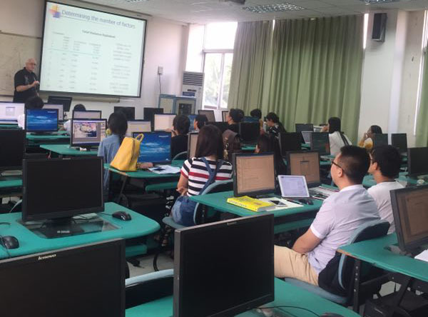 Chris Ryan教授第一天的课程首先通过影片简单介绍了新西兰,接下来讲授了名义群体法在研究中的作用及研究范式,并详细讲解了如何确定研究样本的大小。第二天上午,Chris Ryan教授讲授了问卷设计的相关问题,下午及次日上午,在电脑教室,Chris Ryan教授详细讲解了运用SPSS对问卷进行分析的方法,包括可靠性分析、T检验、因子分析等多种分析方法。第三天下午,Chris Ryan教授介绍了学术论文写作的相关内容。