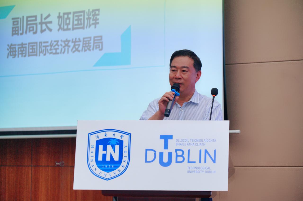 海南国际经济发展局姬国辉副局长作为企业代表致辞,他特别肯定了海南自由贸易港建设新形势下会展业的发展前景,指出会展行业作为新兴朝阳产业将在海南大有可为,并强调了校企合作对于会展业人才培养的重要性。