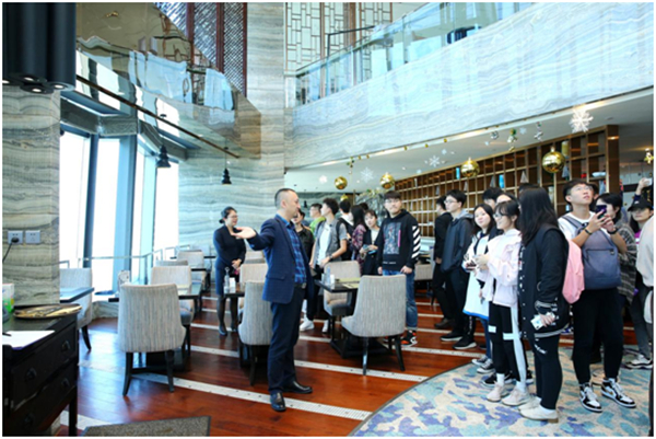 首先,郭强经理通过实地参观酒店三楼、四楼和三十三楼,并就餐厅接待方面进行细心讲解。在三楼宴会厅参观婚礼晚宴场地,对餐饮、婚礼晚宴和客人接待等方面有了初步的了解,更对书本中的理论有了更为深刻的记忆;四楼参观中餐厅时,通过郭强经理耐心的讲解,对餐厅装修风格、转盘装饰和餐厅主题相搭配营造出中式盛宴的视觉效果有了更独到的见解;此外,在酒店三十三楼的特色餐厅和全日餐厅参观时,何经理对餐厅进行基本介绍,之后郭经理为同学们讲解了餐厅选景的意义和相关菜品英文的合理表达以及如何利用英文对中式菜品进行简单介绍,让同学们意识到当今社会对复合型和创新性人才需求的重要性。