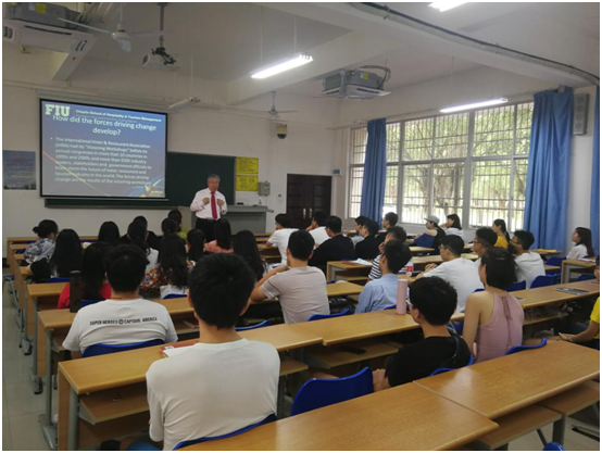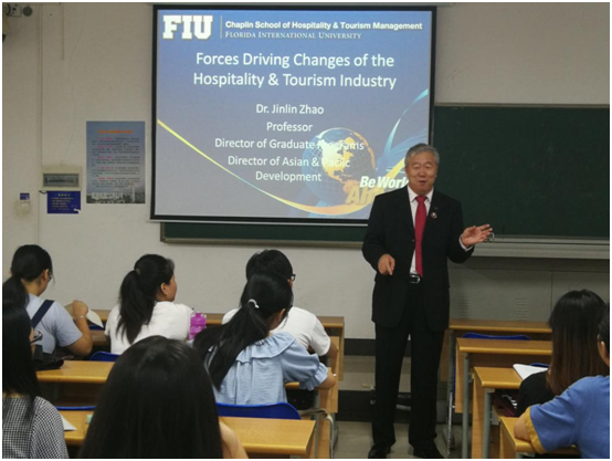 5月27日至6月5日期间,taptap点点体育旅游公司2017级酒店管理专业两个班104位同学迎来了美国弗罗里达国际大学旅游与酒店管理公司终身教授赵金林博士的全英文授课。赵金林教授以酒店业战略发展和创新管理为主题,设计了Forces driving change、Competitive methods、Franchise and management contract、An environmentally sensitive approach等四个讲授主题和一次小组作业考核(Group presentation),两个班的小组作业重点考核了同学们用驱动力模型、环境分析模型等对酒店集团进行了分析并进行了PPT全英文分享,最后,赵教授对各小组的研究成果进行了点评。