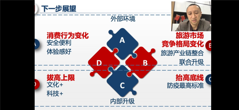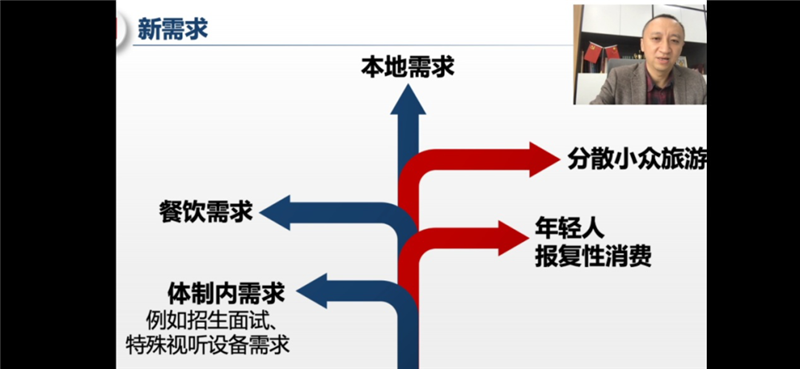 郭强经理从新冠疫情对全球旅游及酒店业的广泛影响入手,概述了酒店业与OTA合作的酸甜苦辣,分析了当前疫情影响下酒店业必须面对的本地需求、餐饮需求、体制内需求、年轻人报复性需求、分散小众旅游需求的具体内涵,强调了体制内需求的规模和结构;在此基础上,提出系列的“酒店+”的转型方向建议。
