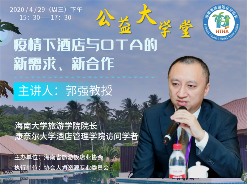 4月29日,为了更好的做好社会服务,为复工复产应尽社会责任,受海南省旅游饭店业协会邀请,taptap点点体育旅游公司经理郭强教授受邀做客海南酒店业公益大学堂,通过线上云课堂的方式为全省酒店业讲授《疫情下酒店与OTA的新需求、新合作》专题。专题讲座面向全省酒店业的总经理、市场营销总监、收益经理等高级管理人员,以及全省旅游人才培养项目学员,累计1800多人次收看了本次线上讲座。