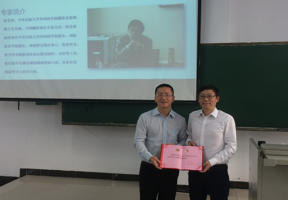 王永强副经理向何克勇教授颁发冬季小学期“外聘专家”聘书