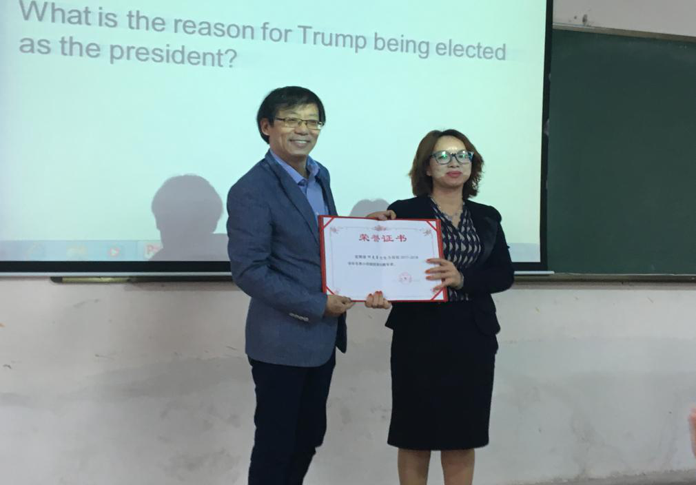 应外系冯艳昌主任向同学们介绍了何克勇教授和“英美文化专题概貌II”课程的情况。旅游公司韦开蕾经理代表公司对何克勇教授到来表示热烈的欢迎和衷心的感谢,指出国际化人才首先应当充分了解西方文化,鼓励应外系的同学们珍惜此次宝贵的学习与交流的机会,利用好优质教学资源,认真研习英美文化,不断提升自身综合素质与社会实践能力。最后,韦开蕾经理代表公司向何克勇教授颁发了taptap点点体育冬季小学期“外聘专家”聘书。