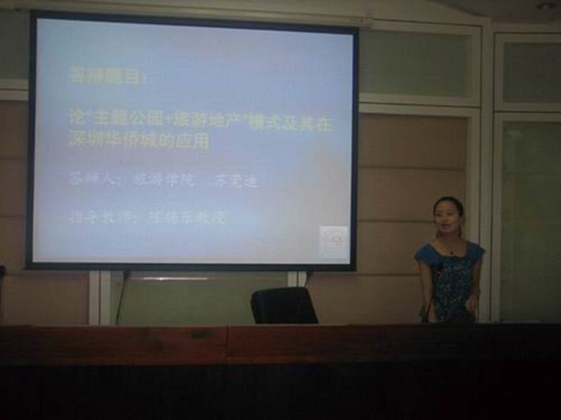 苏莞迪同学的答辩论文题目为:“论“主题公园+旅游地产”模式及其在深圳华侨城的应用”。在前人研究的研究基础上,苏莞迪同学通过定性分析和定量研究相结合等研究方法,就主题公园、旅游地产和“主题公园+旅游地产”三个基本概念、主题公园广阔的市场前景、主题公园与旅游地产的互动关系以及“主题公园+旅游地产”经营模式在深圳华侨城的融合等方面深入探讨;论证了“主题公园+旅游地产”经营模式所具有的推广的可行性;同时还从消费者支付能力不足等方面分析了“主题公园+旅游地产”模式发展过程中可能存在的障碍因素并针对主题公园的持续发展,提出了“经营方式要灵活多样,经营组织要创新”等有利于“主题公园+旅游地产”发展规划的建议。苏莞迪同学的论文选题新颖,概念清楚,结合多媒体课件,图表,图文并茂,思路清晰,论述过程中语言清晰流畅。回答答辩组老师提问时,思路敏捷,准备充分。对现场同学提问,应对自如,礼貌谦虚,很好地展现了旅游公司优秀毕业生的风采,给到场观众留下了深刻的印象,赢得了在场师生的高度赞扬!