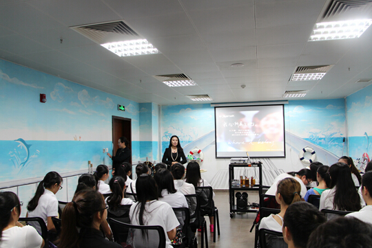 在酒店,总经理姜丽女士向该班同学讲述了万豪集团及海口万豪酒店的相关情况。包括万豪的历史、旗下的酒店品牌以及未来一年海口即将开业的酒店的建造地图、海口万豪酒店的历史和建筑风格等等。最重要的是,同学们由此得知了支撑着这个庞大企业生长、存活的心脏,就是它的核心理念——与高科技接轨,行为正直,以人为本,拥抱变革,服务全球。关于“以人为本”这个自古以来就传唱的精神,在万豪这里拥有了全新的解释:酒店经营以员工为重心,做到让员工满意,员工才能让顾客满意。