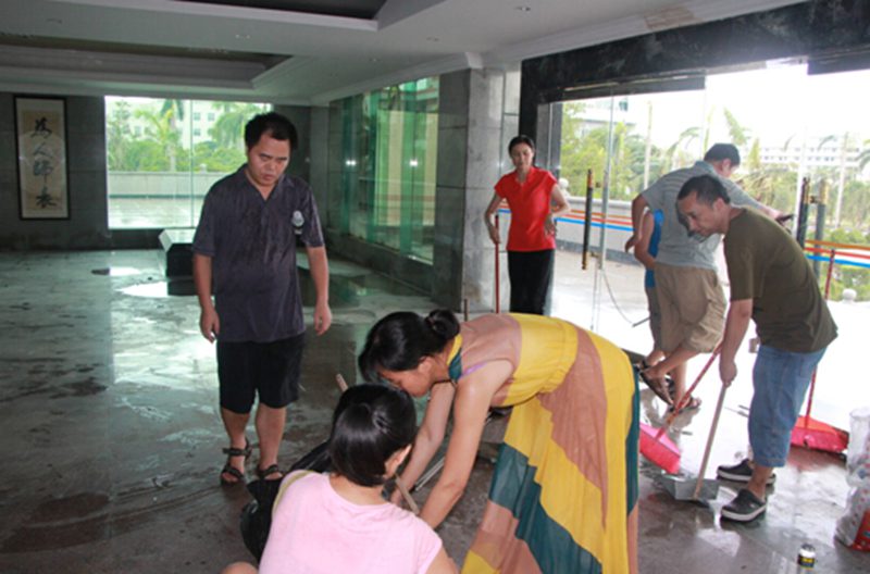 台风刚过,公司党委书记韩淑梅,经理王琳、原党委书记吕裕昌,副经理郭强、副经理胡涛,公司办公室主任李晓东、副主任甘泉、实验室主任王康寿,携同公司综合办、教研办、学工办、实验室等工作人员及部分留校员工,积极开展并部署了校园灾后自救活动。