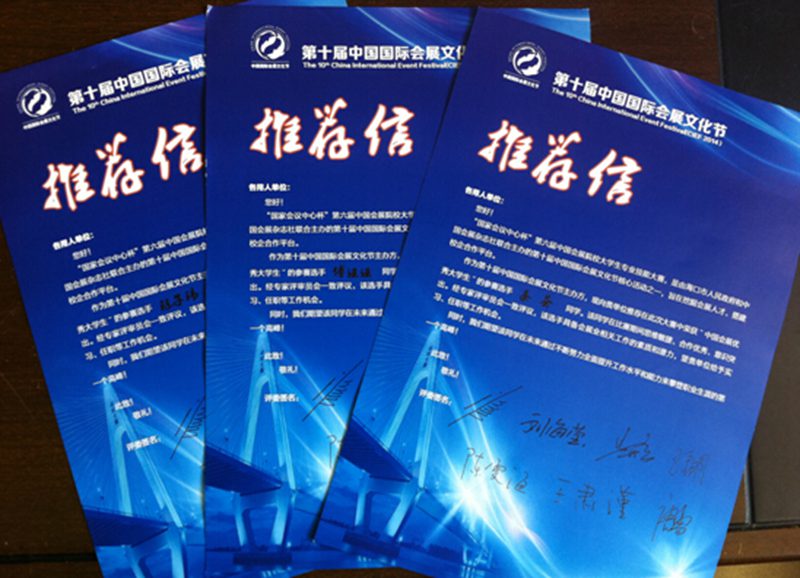中国会展理事会理事长刘海莹等专家评委亲笔签名的就业推荐信