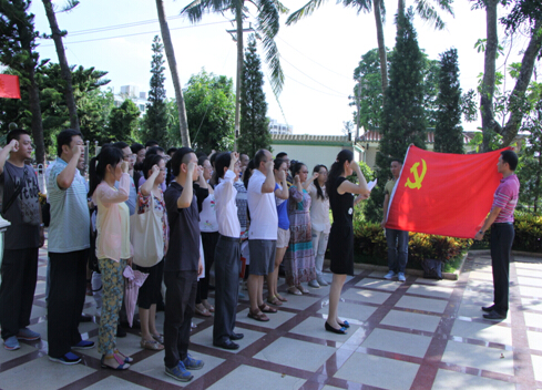 为了庆祝中国共产党成立94周年,进一步加强教工党员的沟通交流、增强基层党组织凝聚力,7月1日下午,旅游公司党委组织教职工党员开展了系列活动,内容有:参观海南省规划展览馆、赴李硕勋烈士纪念亭缅怀先烈并重温入党誓词、开展东寨港红树林景区考察交流等活动,公司四十多名教工党员参加了此次活动。首先,党员同志们在海南省规划展览馆进行参观学习,通过讲解员的引导参观和详细解说,党员们对海南省的发展历史、建设成效以及未来发展规划有了更加全面和深入的了解,对国际旅游岛建设充满了信心。参观活动之后,大家一起来到李硕勋烈士纪念亭,深切缅怀革命先烈,并由公司党委韩淑梅书记领誓,全体党员面对党旗,重温庄严的入党誓词,“我志愿加入中国共产党,拥护党的纲领……”庄严有力的誓言在李硕勋烈士纪念亭上空回响,党员们又一次接受光荣的洗礼,感受到心灵的震撼,也更增强了作为中国共产党党员的历史责任感和使命感。最后,大家一起赶赴东寨港红树林景区,结合老师们自身的专业知识,在景区认真开展考察调研,并与景区管理人员进行沟通交流,对景区规划和建设发展提出了建议意见。