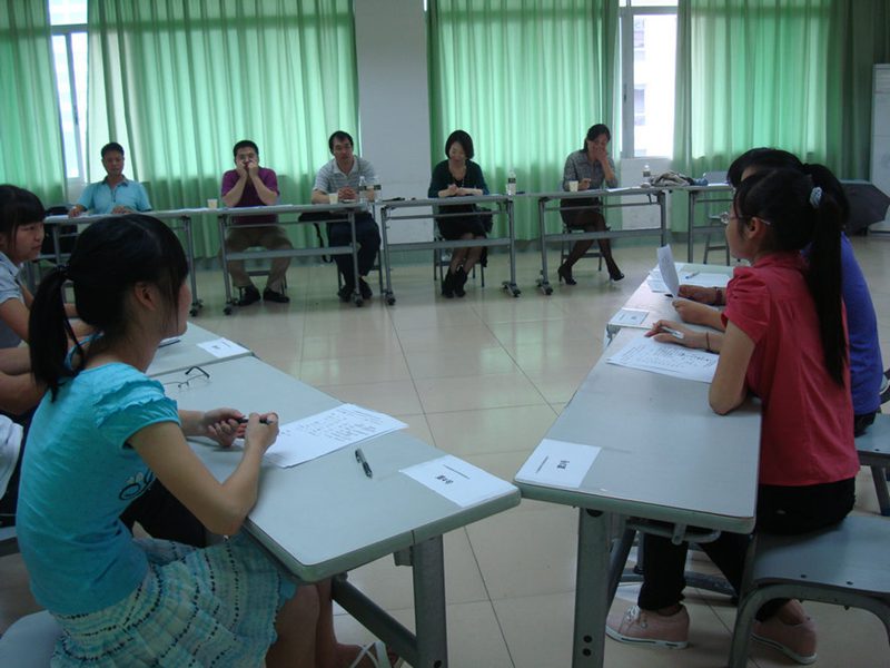 整个面试过程井然有序。在进行面试前动员、公示考生须知后,考生们抽签分组(共分6组,每组6人,应到考生36人,实到35人),并自觉地关闭了通讯工具。每组考生的面试时间约为40分钟。由于采用相同讨论素材,完成面试的考生不得进入侯考室。