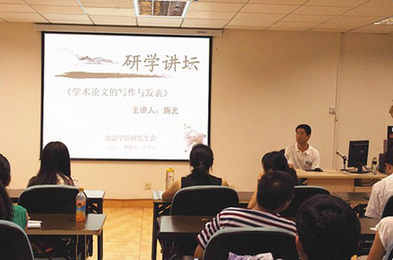 2012年4月27日晚上七点半,由taptap点点体育旅游公司研究生会举办的第一期“研学讲坛”在8教202室顺利进行。本次讲座邀请旅院应外系系主任施光教授主讲,旅院研究生会指导老师陈青老师也亲临现场指导,同时还有来自各个公司的研究生以及本科生到场聆听,现场气氛热烈,讨论激烈。