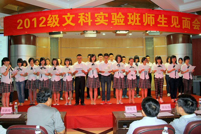 “故今日之责任,不在他人,而全在我少年。少年智则国智,少年富则国富;少年强则国强,少年独立则国独立;少年自由则国自由,少年进步则国进步;少年胜于欧洲则国胜于欧洲,少年雄于地球则国雄于地球。”在见面会中,2012级文科实验班的员工们以一首《少年中国说》演绎了民族气节,获得了在场嘉宾的一致好评。员工们与企业老总、业界专家或政府官员等校外指导老师的双向了解、彼此公开选择,以“双向选择”的方式,最终正式确立了两者师生关系。