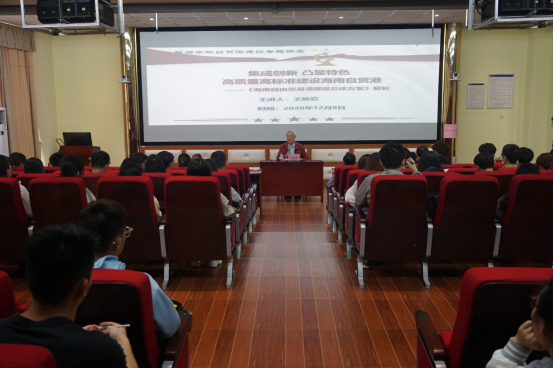 王峻岩教授从海南自贸港建设重大意义、建设海南自贸港的“新”和“特”、建设海南自由贸易港的方式和进程三个方面全面的分析了《海南自由贸易港建设总体方案》为海南带来的影响。王峻岩教授指出海南自贸港建设是党中央全面推进中国特色社会主义发展的重要部分,是探索和推进高水平开发的战略选择,是建立开放型经济体系的根本要求,是贯彻发展新理念的重大举措,是构建人类命运共同体的实际行动。随后,王峻岩教授阐述了海南自由贸易港的模式创新、制度创新、治理方式创新以及中国特色、地域特色、特中之特。此外,王峻岩教授重点讲授了海南自由贸易港建设的三个阶段,阐明了重点任务,特别强调要行稳致远、久久为功。