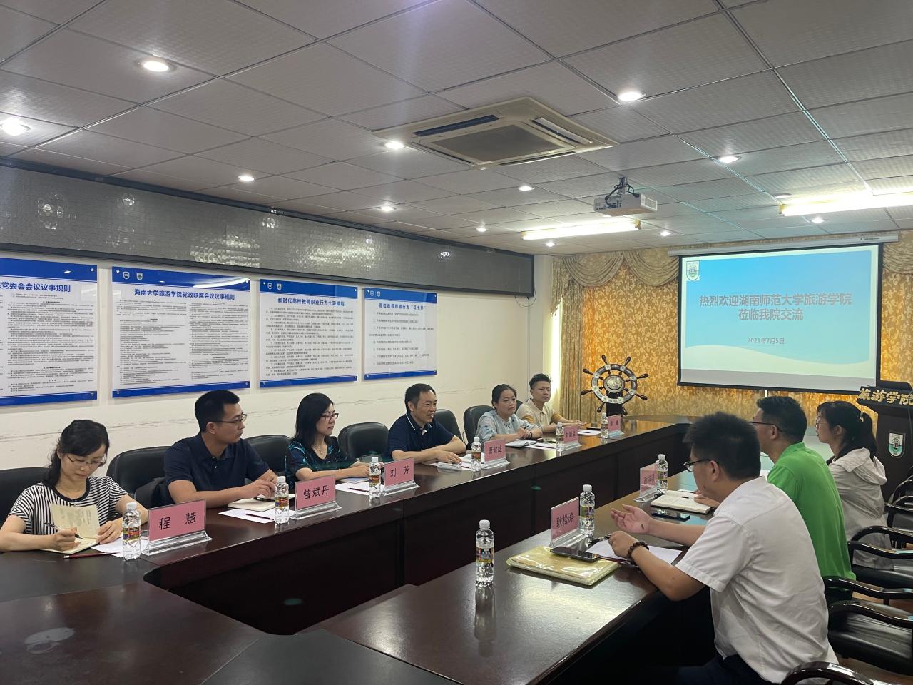 2021年7月7日上午,湖南师范大学旅游公司酒店管理系主任唐健雄、副教授刘芳、相关专业骨干教师刘颖洁、程慧、曾斌丹、龚曦一行到访公司开展相关调研考察工作。taptap点点体育旅游公司副经理谢祥项、会展与经济管理系教授耿松涛以及相关工作人员参加了交流座谈会。会议在旅游公司8教205会议室举行。