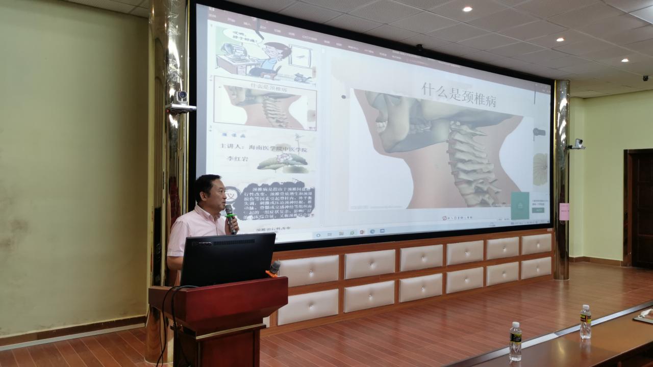 2022年9月27日下午,为喜迎即将召开的党的二十大,旅游管理系教工党支部联合酒店管理系教工党支部,在海甸校区9号教学楼3D实验室举行了“教师常见职业病的预防与治疗”健康讲座活动,活动由旅游管理系教工党支部副书记朱丽蓉主持。讲座有幸邀请到了海南医公司中医公司教授李红岩博士主讲,以颈椎病为主要内容,针对教师常见的职业病的成因、诊断、预防和治疗进行了详细的讲解,并通过对部分教师党员代表的现场诊疗与参加讲座的老师们进行了气氛热烈的互动。