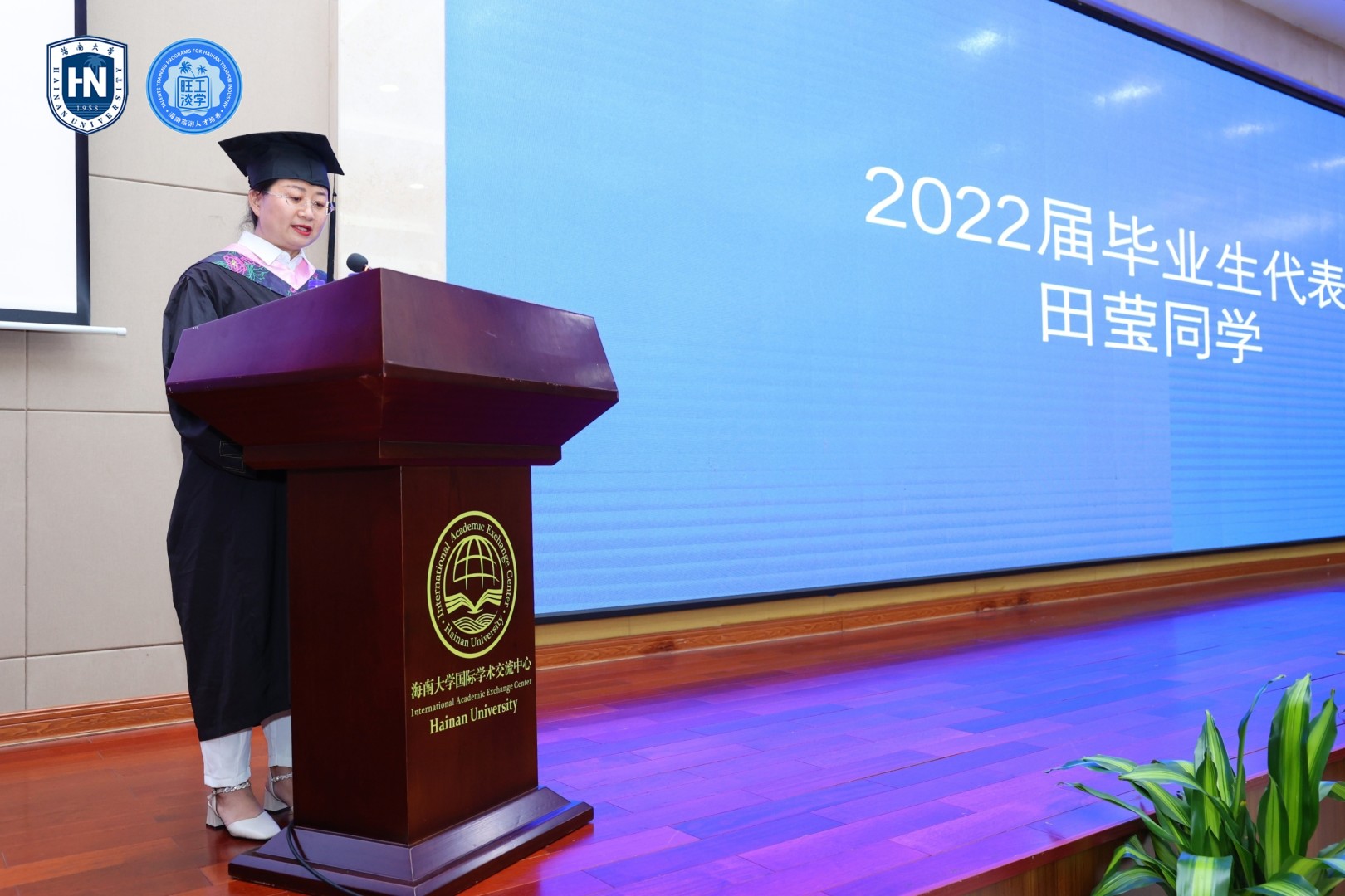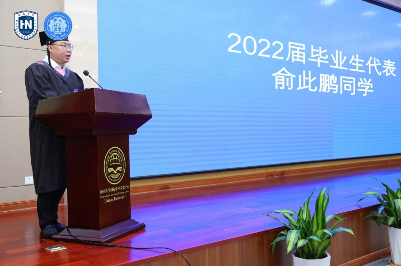 在师生代表发言环节,田莹同学和俞此鹏同学作为毕业生代表回顾了求学过程的难忘记忆和所获得的理论提升,表示会将学到的知识和智慧应用到工作中去,服务于海南自贸港建设中去。