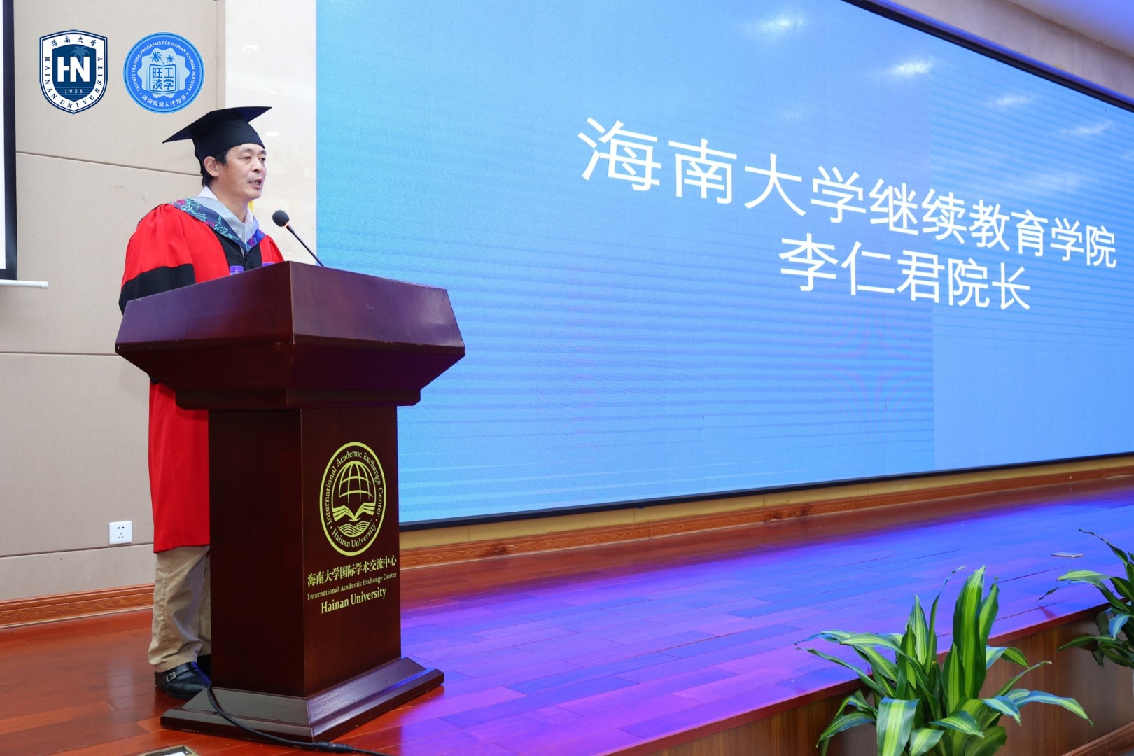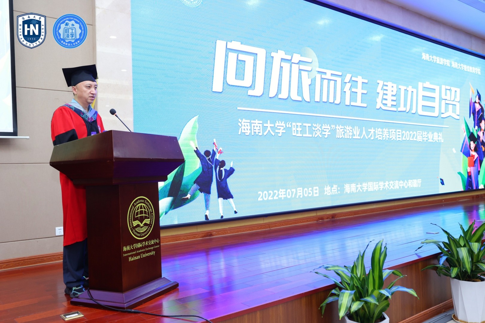 在领导致辞环节,海南省旅游和文化广电体育厅人才教育处李恩处长首先致辞,他对首届毕业生表达了祝贺与祝福,回顾了“旺工淡学”项目从创办到目前的发展过程和持续创新的亮点,介绍了自2019年7月启动以来,累计有15811名旅游业从业人员被录取参加项目学习。生源从最开始的酒店业拓展到2020年的旅游景区、旅行社和旅游餐饮,今年又拓展到了免税购物、旅游商品与装备、高尔夫、乡村旅游等涉旅行业。他表示,“旺工淡学”旅游业人才培养模式在2020年4月被海南省委深改办列为海南自由贸易港首批制度创新案例对外发布。同时,该项目已得到国家发改委和商务部的认可,并向国办、中办报送推荐,在全国复制推广,尤其是2021年4月份项目作为全省六个优秀案例之一,向中央组织部举办的全国自贸区厅局级领导干部“推进自由贸易试验区建设”培训班学员进行展示和汇报,获得中央组织部、省委组织部、省委深改办和参训学员的一致好评。与此同时,项目得到了沈晓明书记的亲笔批示,获得了2021年度海南省政府创新奖三等奖,在旅游人才发展和职业教育改革创新方面,为全国提供了海南经验。