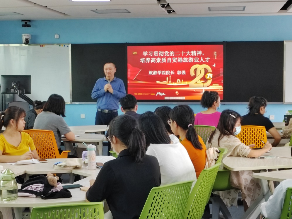 讲座上,郭强经理从15个方面解读了党的二十大报告内容,高度肯定党的十年发展成果。同时,郭院针对海南自贸港建设发表了意见,认为自贸港建设能够有充分发挥中国14亿人的超大市场优势,促进交易与资金回流。而在自贸港人才的培养方面,郭院提出第一要点是责任和担当,第二才是能力与知识结构。为此,郭院勉励在座的各位老师与同学,不断提高自身素质和能力,将论文写在祖国的大地上,为建设旅游强国贡献自己的力量。