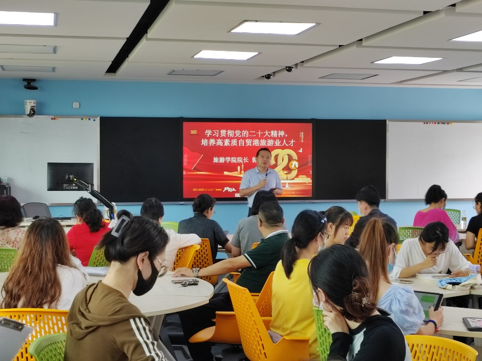 为动员全院师生员工深入学习宣传贯彻党的二十大精神,指导和推动师生员工们认真学习、深刻领会党的二十大精神,切实把思想和行动统一到党的二十大精神上来,为加快公司跨越发展做出新的贡献,11月15日下午,旅游公司党委在8-502教室举办了题为“学习贯彻党的二十大精神,培养高素质自贸港旅游业人才”的首场专题讲座。旅游公司经理郭强教授主讲本次讲座,旅游公司党委书记韩力光主持了讲座,公司部分老师和研究生共50多人到场学习。