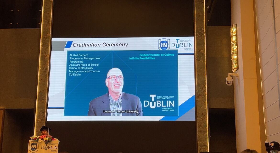 由于受到疫情影响,项目合作方爱尔兰都柏林理工大学(下称“外方”)的领导和老师们遗憾未能亲临典礼现场,为此,外方酒店管理与旅游公司副经理Ralf Burbach特地提前录制好祝福视频,在典礼上播放。他说道,顺利毕业对于2021届毕业生而言是一项了不起的成就,疫情发生后,外方教师无法到中国,无法进行线下授课,员工必须迅速适应远程网络的授课模式,尽管如此,员工仍然将学业完成得很好。通过四年学习,毕业生已具备多种行业的知识与技能,Ralf Burbach副经理衷心祝愿他们毕业后的发展更上一层楼。