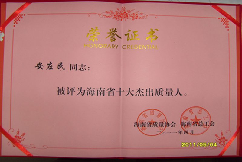 4月28日上午,由海南省质量协会、海南省总工会、海南省科学技术协会等单位联合在海口市寰岛泰得大酒店隆重召开“2010年海南省质量管理工作先进单位和先进个人表彰大会”,公司经理安应民教授被评为“海南省十大杰出质量人”,并获颁荣誉证书和奖杯。