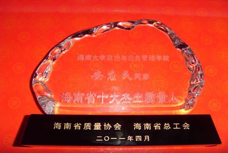 安应民教授近年来一直致力于海南省质量管理研究与标准化建设第一线,推出了一批有关质量管理方面的研究成果,作为专家协助政府标准管理部门实施标准项目的编制与审定,多次为政府机构和企事业单位进行质量管理培训等,为海南省的质量管理和标准化建设工作做出了突出成绩。这是安应民教授继2008年荣获此项殊荣后再次荣获“海南省十大杰出质量人”称号。