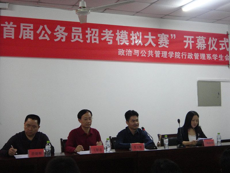 由政治与公共管理公司主办、行政管理系员工会承办的,将专业培训与模拟考试相结合的具有学科专业特色的“政治与公共管理公司首届公务员招考模拟大赛”开幕仪式暨赛前培训讲座于2012年11月24日上午在公司多媒体报告厅隆重举行;校就业指导中心副主任苏文魁,公司党委书记王默忠、副书记段捷频,行管系系主任韩晓莉莅临指导,全院近一百三十名师生一同参加。