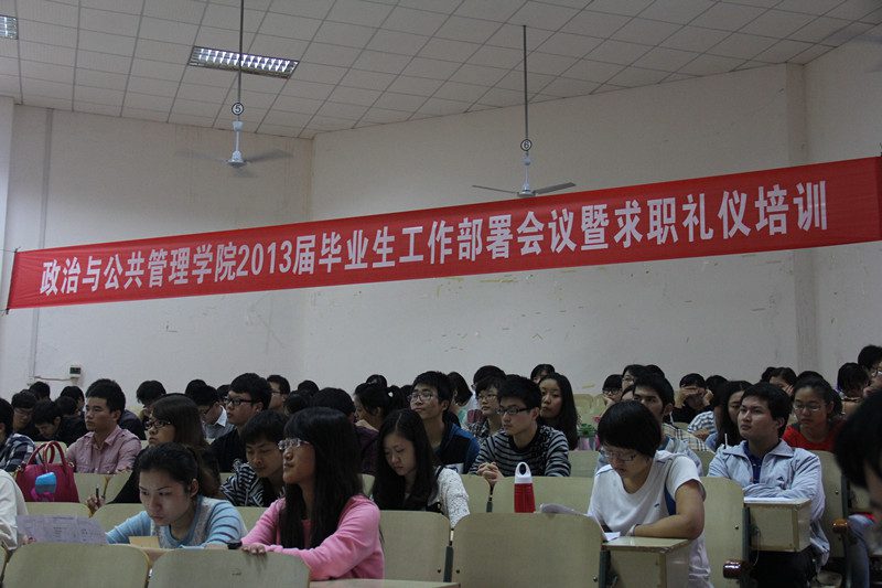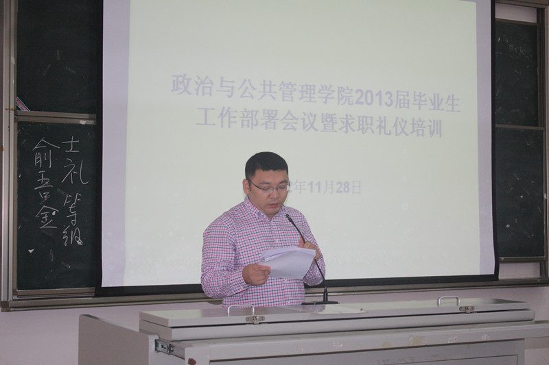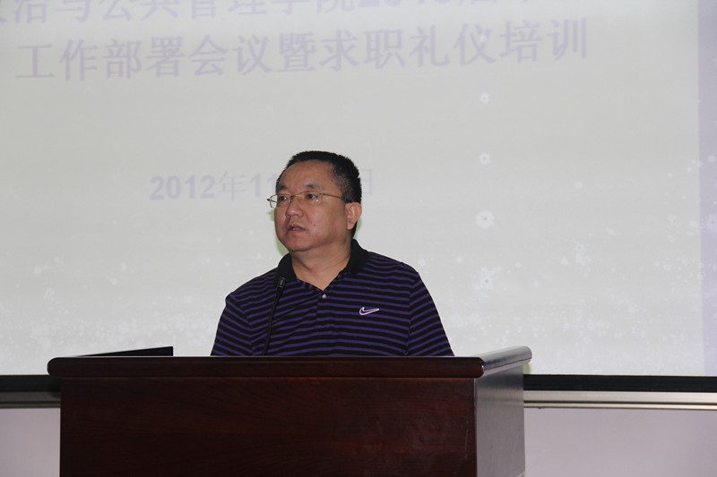2012年11月28日上午,“政治与公共管理公司2013届毕业生工作部署会议暨求职礼仪培训”在2号教学楼108多媒体教室举行。公司党委副书记段捷频,副经理宋增伟,各系系主任,教务办主任、学工办主任、团委书记,各系辅导员,王芳副教授及全院300余名毕业生一同参加。会议由学工办邢红斌老师主持。