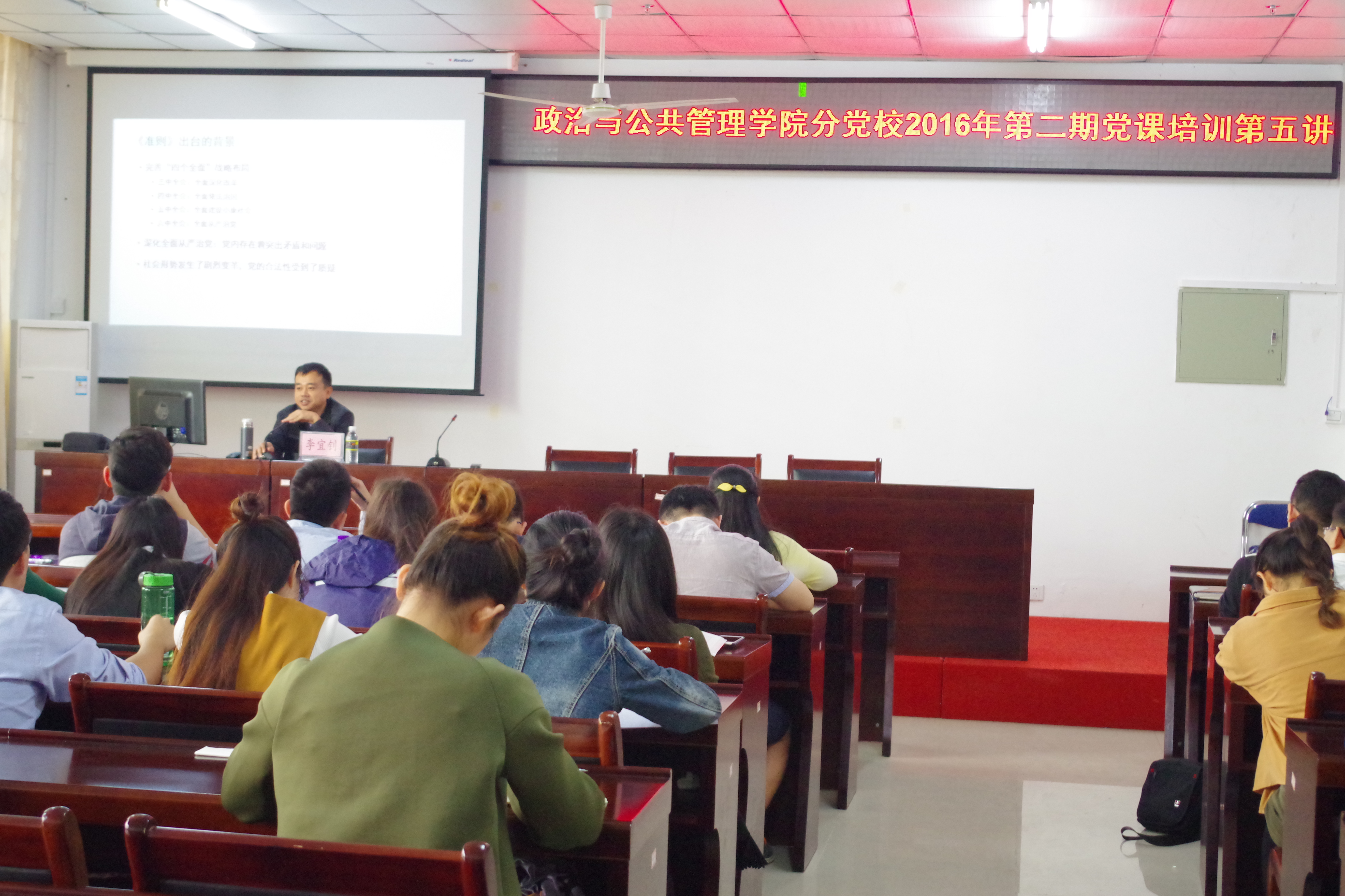 2016年12月6日,政治与公共管理公司分党校2016年第二期党课培训第五讲在社科楼A111举行,政管公司全体入党发展对象参加了此次培训。李宜钊副经理为主讲人,给大家讲述了关于党内政治生活的若干准则。