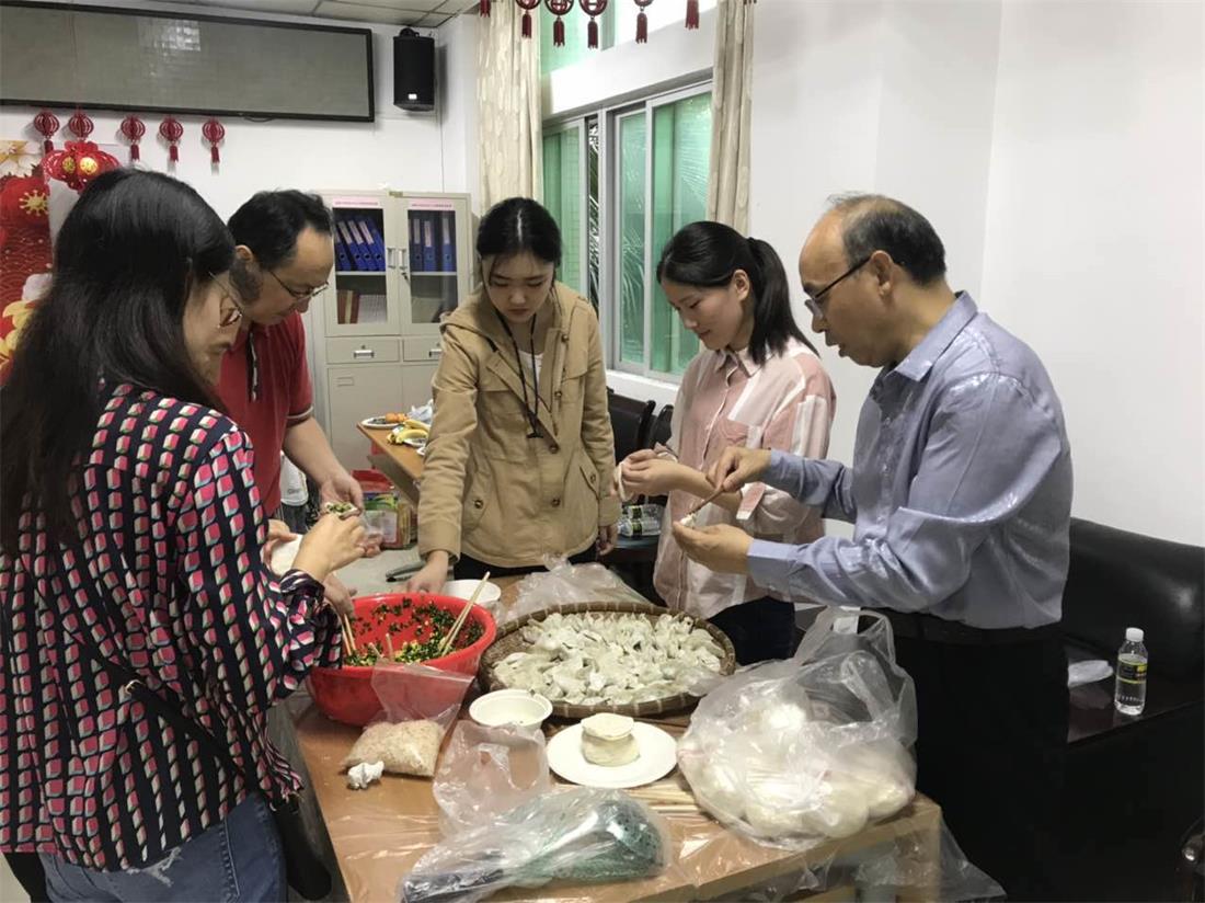 在场的所有教职工一个个兴高采烈,大显身手,和面、调馅、擀皮、包饺子,各有分工,人人能帮上忙,个个能露一手,忙得不亦乐乎,大家其乐融融,现场一片欢声笑语。包出的饺子也是形状各异,大小不一。谈笑间,圆滚滚、胖嘟嘟的饺子一眨眼的功夫就上桌了。