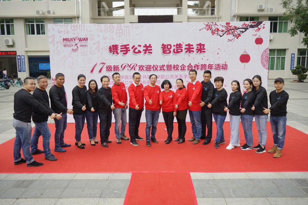 活动首先是2017级新公关人的欢迎仪式。由专业教师与员工携手走上红毯;在观众的掌声中,专业教师与每位同学一一握手拥抱表示祝福并表达同心协力共建公关的美好愿望。自公共管理大类招生以来,公共关系学系,每年都以非常创新创意的形式,迎接新人加入公关大家庭,开启专业公关道路。
