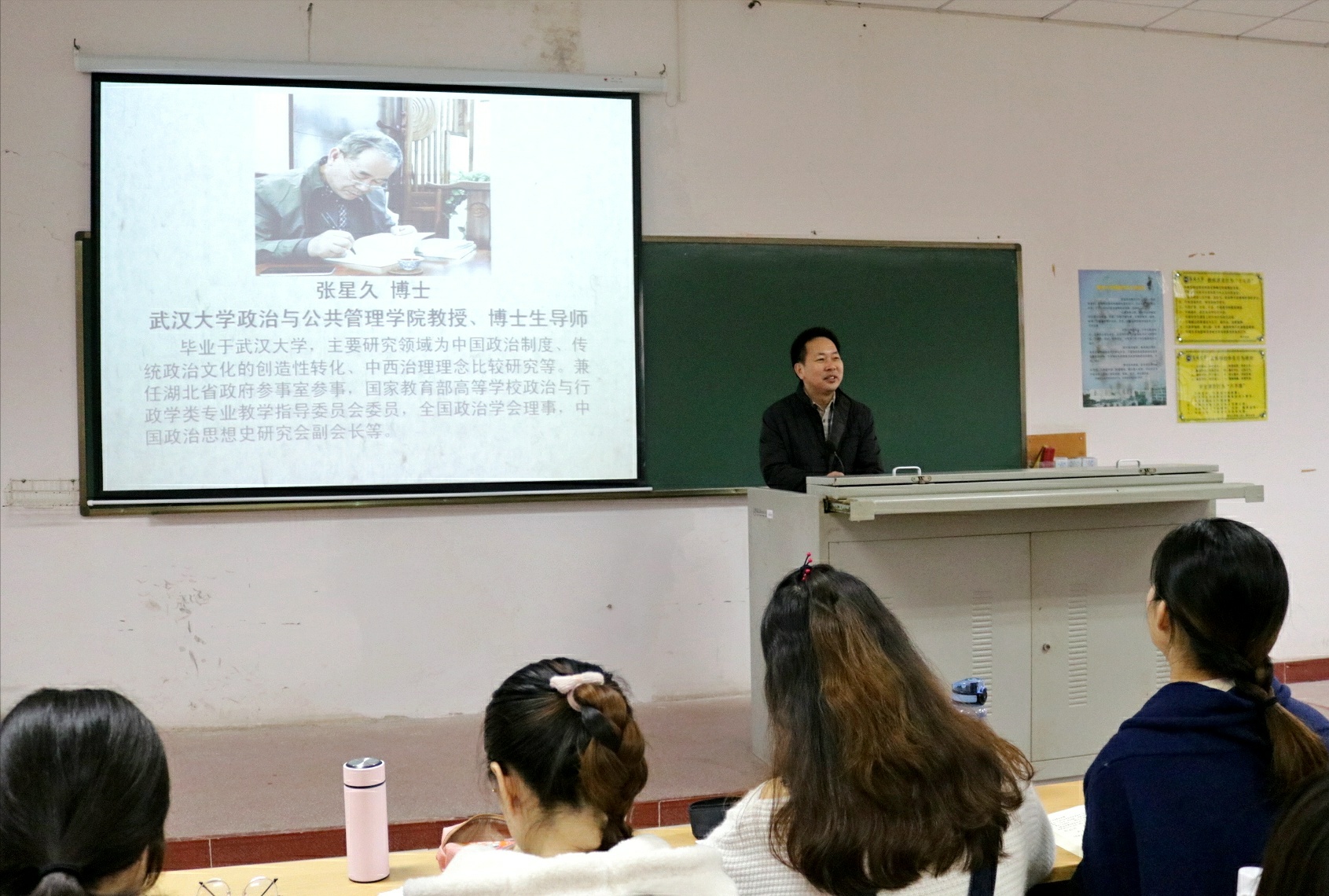 2019年1月2日上午,政治与公共管理公司行政管理系冬季小学期第二讲在2-207教室顺利举行。武汉大学政治与公共管理公司教授、博士生导师张星久老师以“中国传统文化与现代政府管理智慧”为题,给2016、2017级行政管理系同学们带来了一场思想盛宴。公司江红义副经理出席,行政管理系系主任张礼祥老师出席并主持讲座。