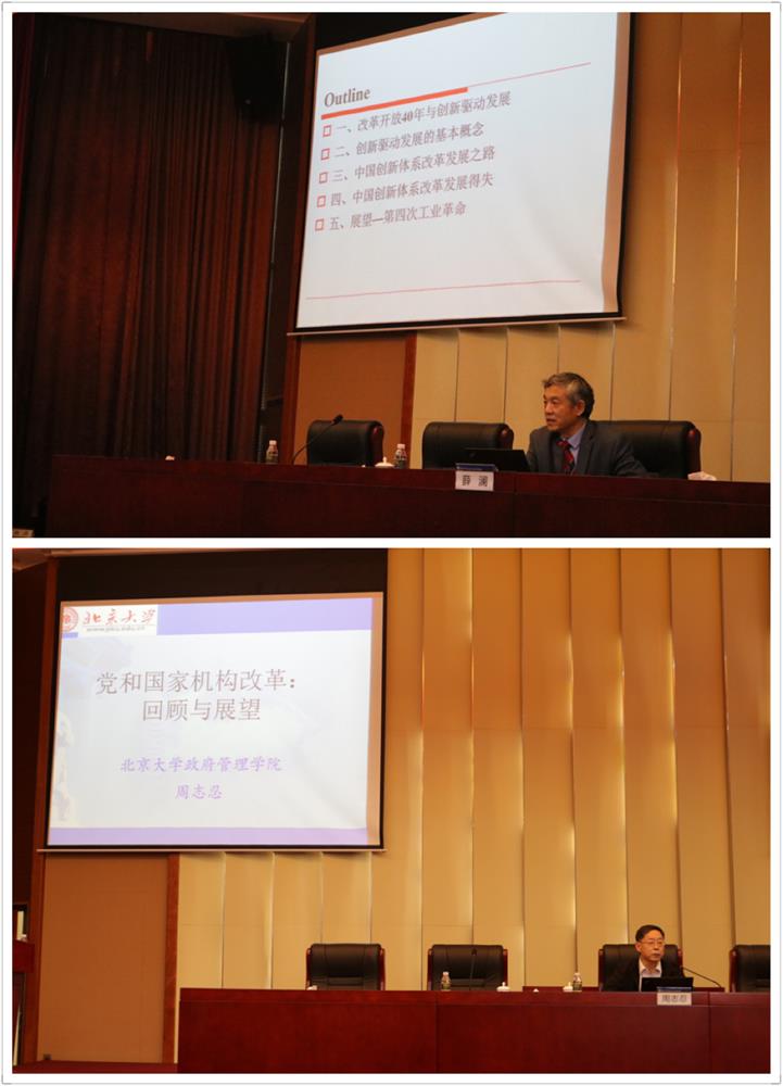 黑龙江何颖教授主持了第一场学术报告会。清华大学薛澜教授做题为《改革开放与驱动创新发展》的主旨讲座。薛澜教授围绕改革开放40年与中国创新驱动发展的联系,对我国科技创新体系与发展历程进行梳理,深入总结剖析了我国创新战略的成功关键与不足之处,进而对我国第四次工业革命前景进行科学展望。武汉大学丁煌教授对本场学术报告进行评议。南京大学孔繁斌教授主持了第二场学术报告会。北京大学周志忍教授以《党和国家机构改革:回顾与展望》为题开展主题报告。周志忍教授立足于国家前7轮大规模的机构改革基本情况,对机构的精简、辅助机构和业余机构的整合和党政关系模式的嬗变等方面进行了系统阐述,并对新一轮机构改革进行深入剖析并提出了新的思考。华中科技大学徐晓林教授对本场报告进行了评议。