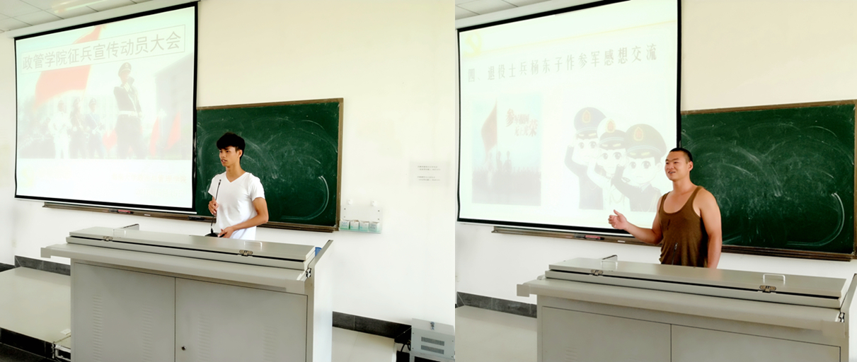 参军视频播出后,已报名入伍的16级行管班长李子成为大家讲解征兵政策,并强调公司为参军同学做出的政策保障。随后,公司退伍士兵杨东子(现在16级公关专业就读)发言,他回忆当初的军旅生活,表示入伍光荣。