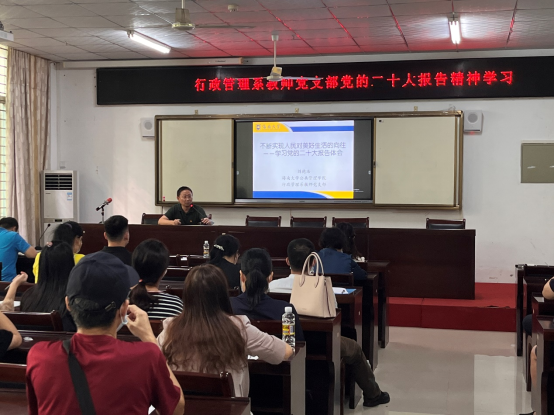 10月25日下午,公共管理公司在社科楼A111召开党员大会,学习传达党的二十大精神。会议由党委书记黄丽芹主持,党政领导班子、全体党员教师参加会议。